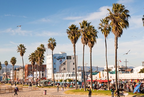 You can rent bikes from a few places near Venice like this one ($6 per hour, $20 per day) and travel the boardwalk, which extends north to Malibu and south along the bay for miles.