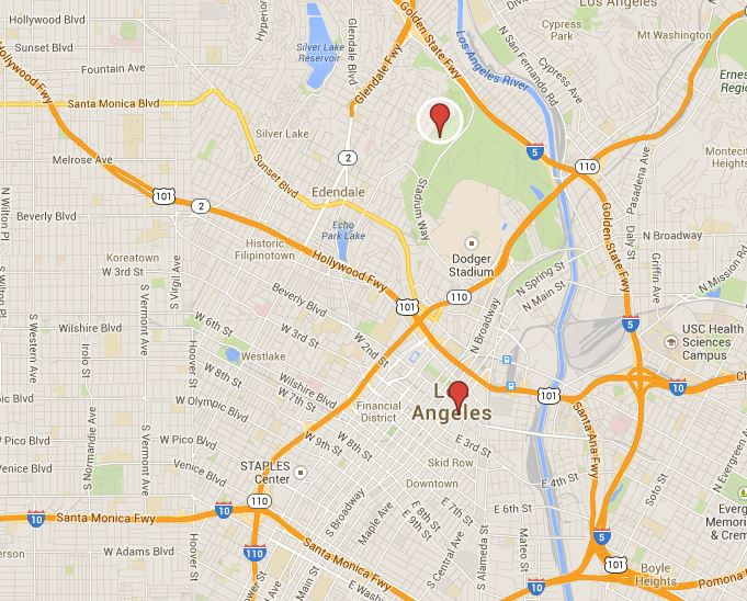 The ceremony and reception will be held at Grace Simons Lodge, 1025 Elysian Park Drive (circled point below in map), in Elysian Park, which is about ten minutes north of Downtown LA.